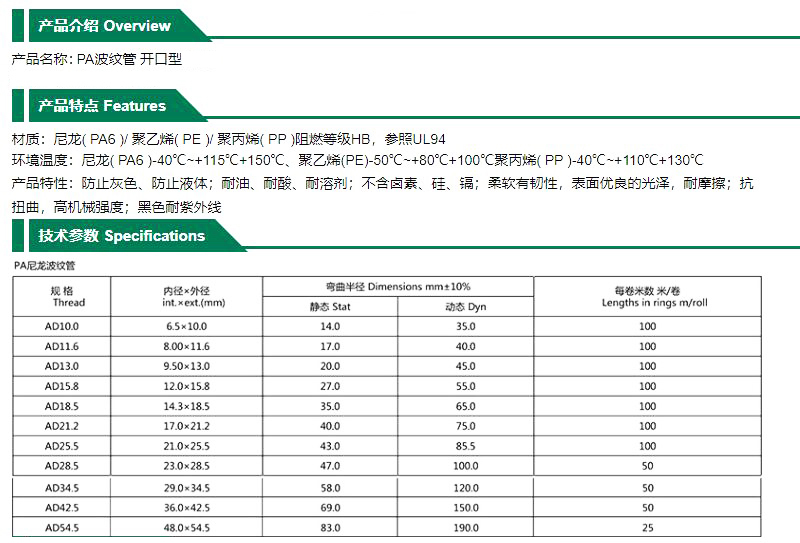 ·材质:尼龙(PA6)/聚乙烯(PE)/聚丙烯(PP)阻燃等级HB,参照UL94 ·环境温度:尼龙(PA6)-40℃~+115℃+150℃、聚乙烯(PE)-50℃~+80℃+100℃聚丙烯(PP)-40℃~+110℃+130℃ ·产品特性:防止灰色、防止液体;耐油、耐酸、耐溶剂;不含卤素、硅、镉;柔软有韧性,表面优良的光泽,耐摩擦;抗扭曲,高机械强度;黑色耐紫外线