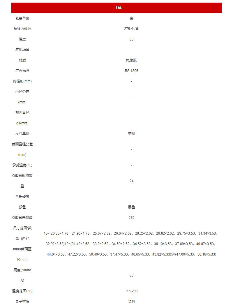 ·由各种标准尺寸氟橡胶O形圈组合而成 ·材质 氟橡胶 ·颜色 黑色 ·硬度 80 ·温度范围(℃)-15~200 ·硬度(ShoreA)80 ·盒子材料 塑料