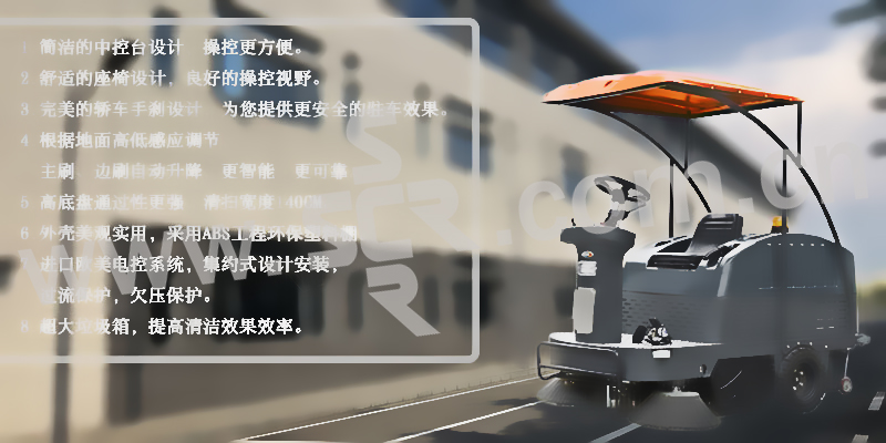 ·简洁的中控台设计,操控更方便·舒适的座椅设计,良好的操控视野·轿车型手刹设计,为您提供更安全的驻车效果·根据地面高低感应调节,主刷、边刷自动升降,更智能,更可靠·高底盘通过性更强,清扫宽度1400mm·外壳美观实用,采用ABS工程环保塑料棚·进口欧美电控系统,集约式设计安装,过流保护,欠压保护·190L超大垃圾箱,提高清洁效果效率