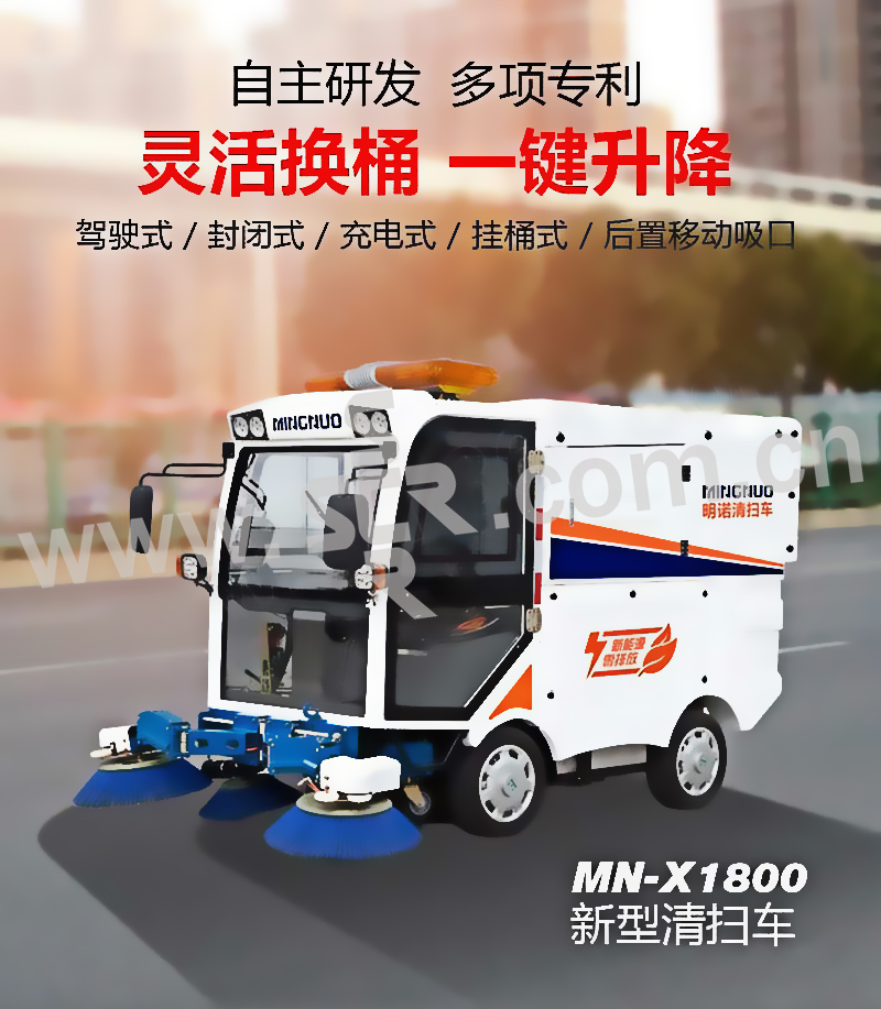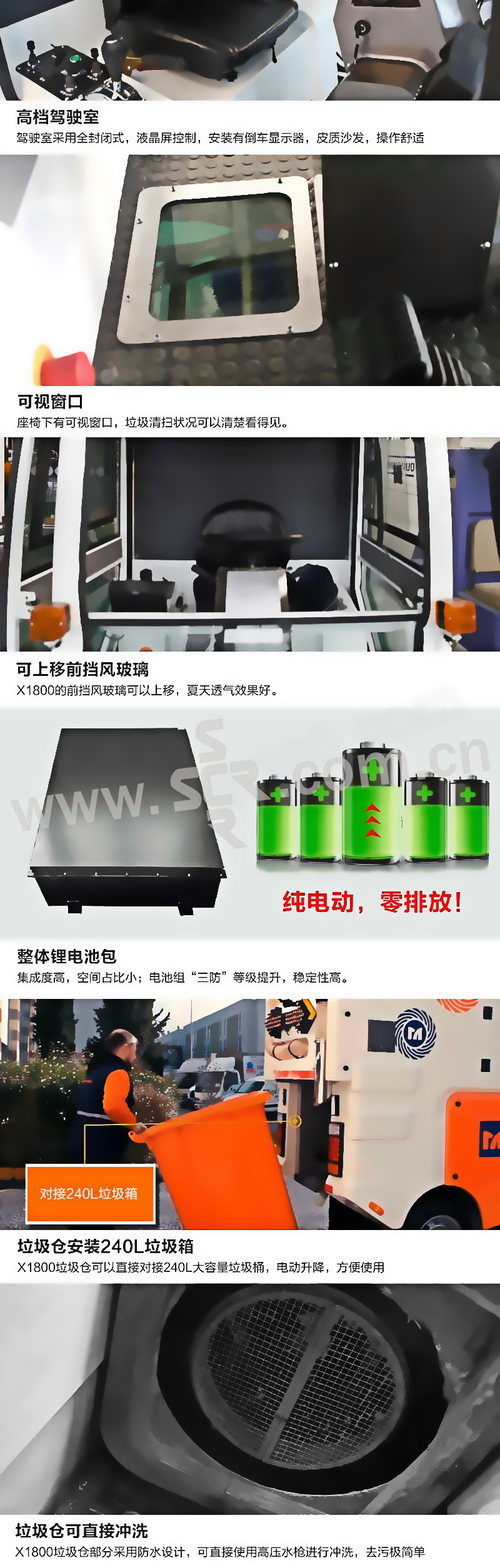 ·整车采用轻量化设计方案,采用整体电池包为动力,电池组集成度高,空间占比小;电池组“三防”等级提升,稳定性高;安装、维护易操作,电池参数、工况信息调用方便。 ·行走系统采用交流变频电机,具有下坡防超速,坡道防溜车,能量回馈,故障报错,CAN通讯等功能。·采用电动助力转向,整车转弯半径小。配有彩色液晶监视器,可在清扫和倒车时观测车后的状况。·清扫作业时车顶安全警示灯、车尾安全导向灯同时闪烁提示行人、行车避让,注意安全。 ·抽吸系统采用交流变频电机,可根据路况调整转速。