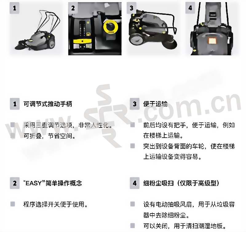 ·配有羊毛细尘过滤器,坚固的塑料机架,易于调整的主刷以及无级调速的边刷