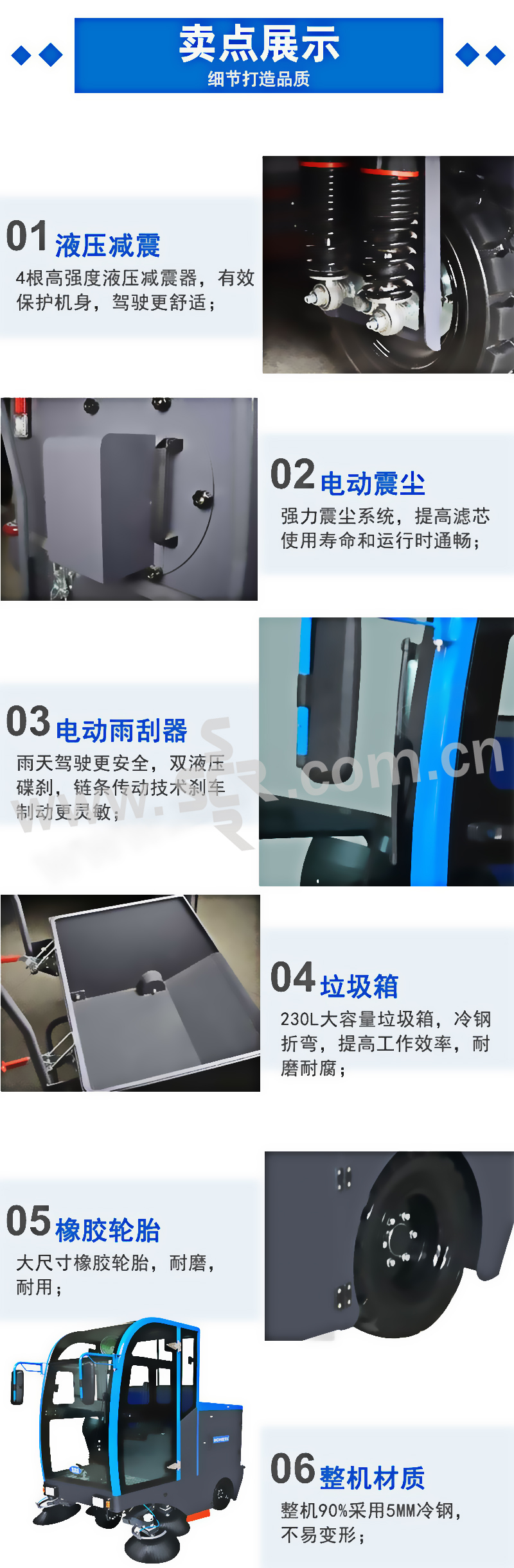 ·4根高强度液压减震器,有效保护机身,驾驶更舒适·电控系统欠压过载保护防止电机过载受损·一键启动电动雨刮器,雨天行驶更安全·强力电动振尘系统,提高滤芯使用寿命和运行时通畅·橡胶实心大轮,耐磨防腐蚀·整车90%采用5MM加厚冷钢,坚固耐用,不易变形