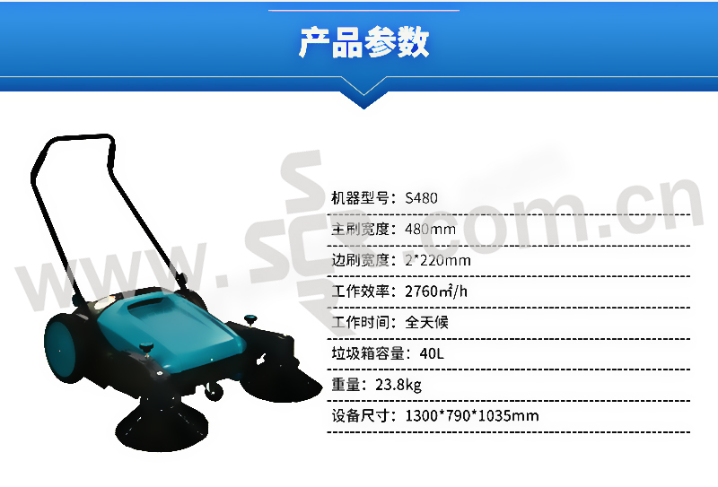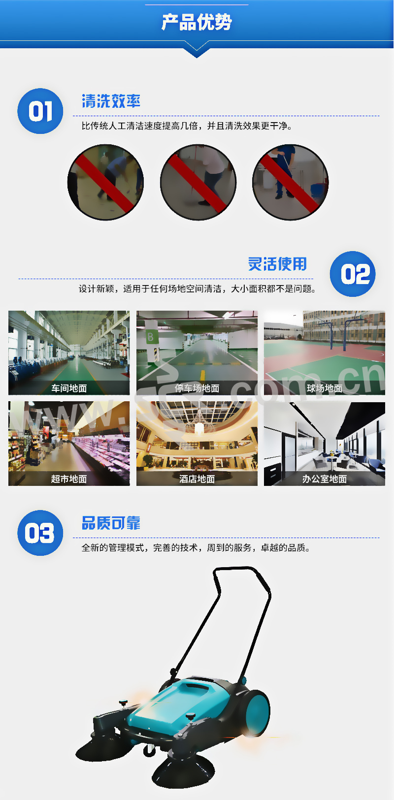 ·手推式吸尘扫地机设计轻巧轻便,环保经济适用。具有强劲的清扫系统和高效吸尘,过滤系统能够使垃圾一扫而光。无需专业操作人员;·40L垃圾箱倾倒垃圾更便携方便;·配备手动式振动器彻底清空过滤器,垃圾清理更彻底;·易损件(边刷、主刷)更换快捷方便,无需专业工具机器操作更灵便