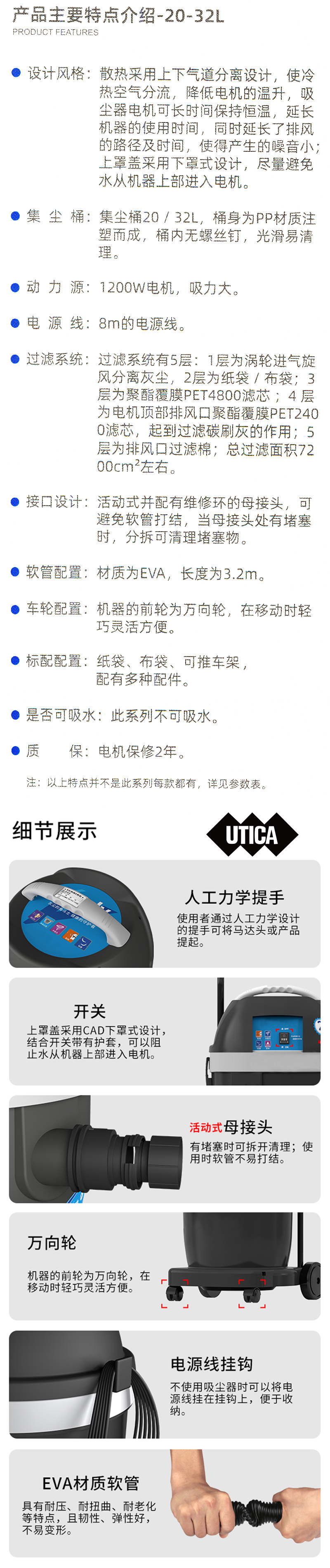 集尘桶20/32L,桶身为PP材质注塑而成,桶内无螺丝,光滑易清理。 |