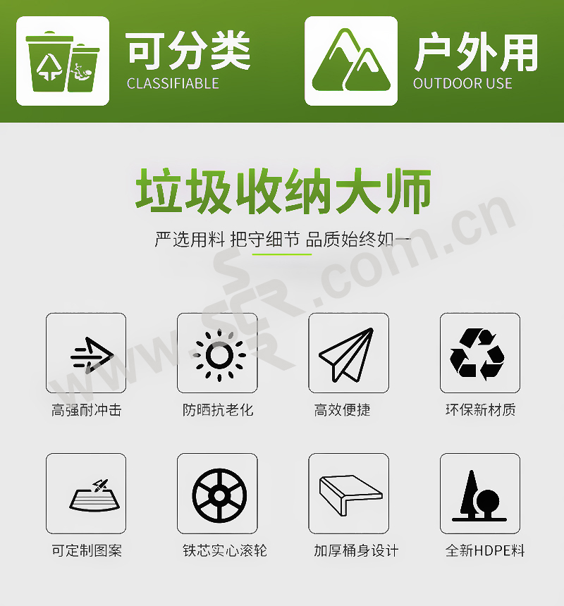 ·耐酸,耐碱,耐腐蚀,耐候性强,表面光洁,减少垃圾残留,易于清洁,可相互套叠,方便运输,节省空间与费用,有多款颜色选择,可根据分类需求随心搭配
