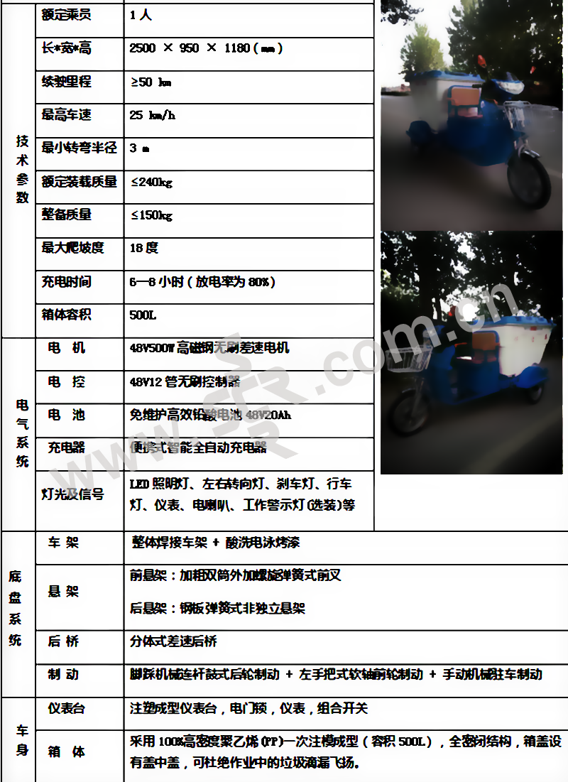 ·采用100%高密度聚乙烯(PP)一次注模成型,容积500L,全密闭结构,箱盖设有盖中盖,可杜绝作业中的垃圾滴漏飞扬·脚踩机械连杆鼓式后轮制动+左手把式软轴前轮制动+手动机械驻车制动·便携式智能全自动充电器