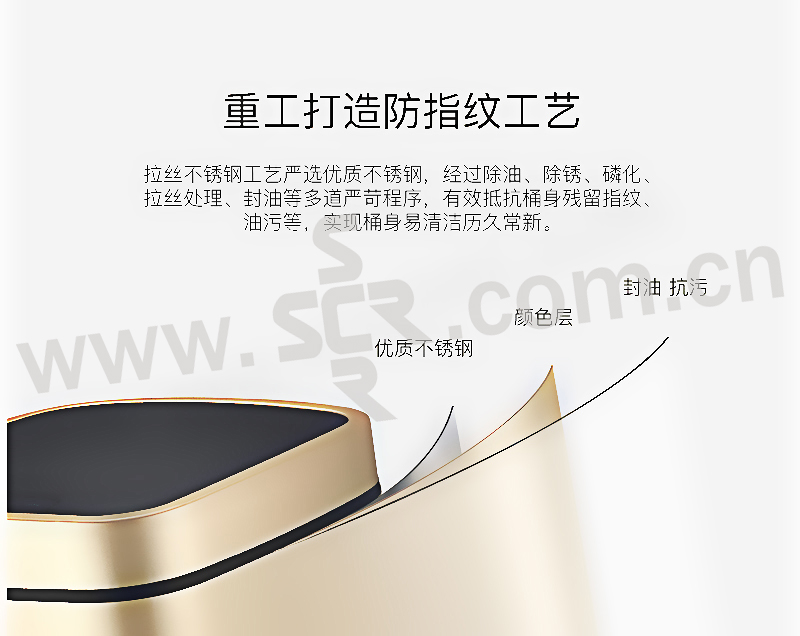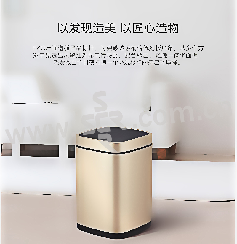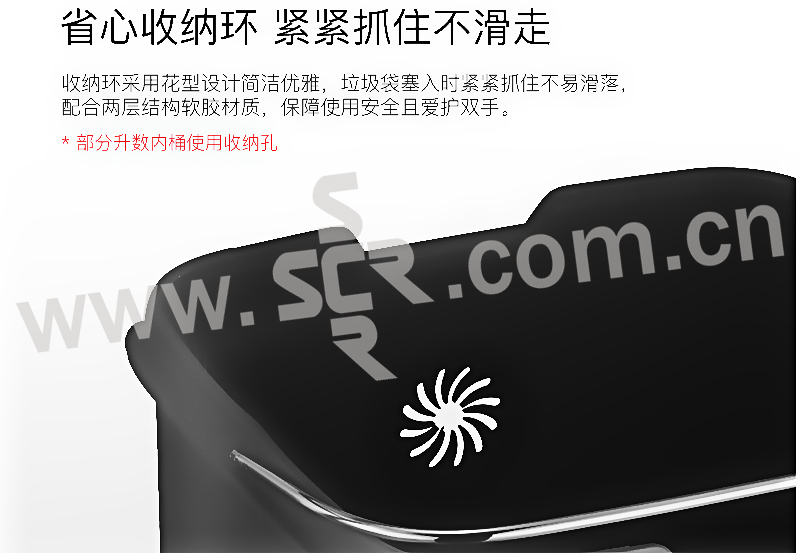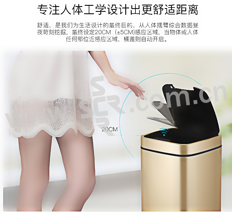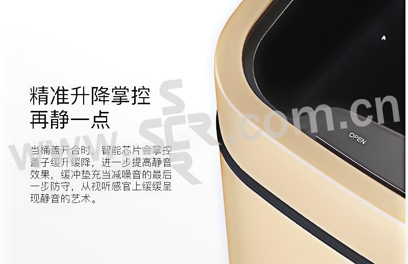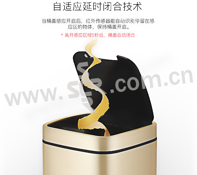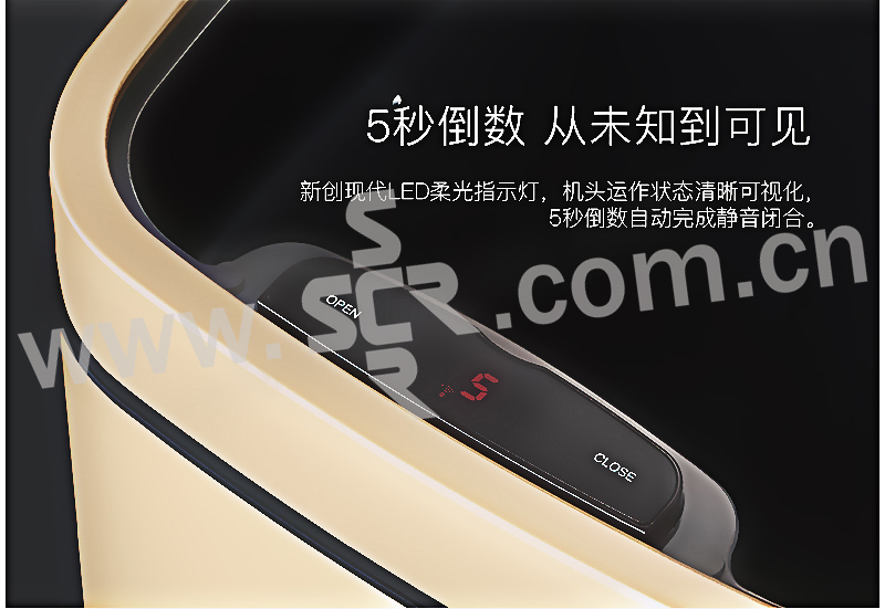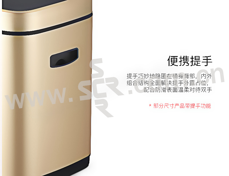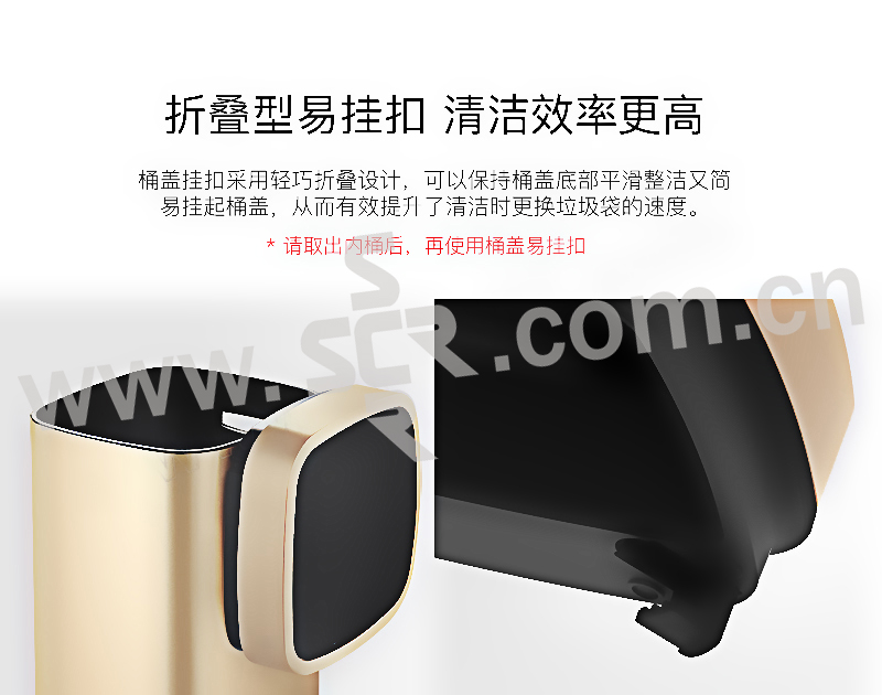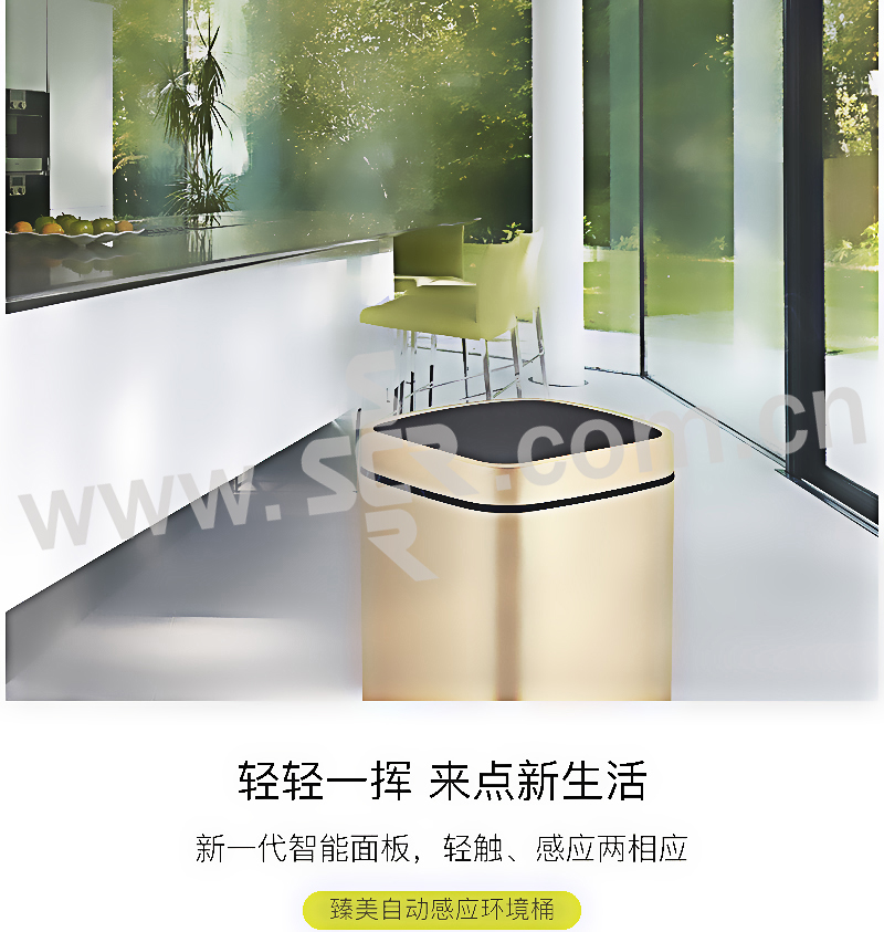 ·触摸面板,一体式全新感官·便携提手,防滑底座,拉丝不锈钢工艺·折叠型易挂钩,清洁效率高·LED柔光指示灯,5秒倒数自动静音闭合·20cm感应距离,桶盖自动开启·两用电源支持,节能更环保·省心收纳环,一体成型无缝内桶