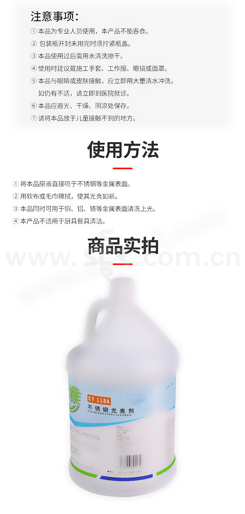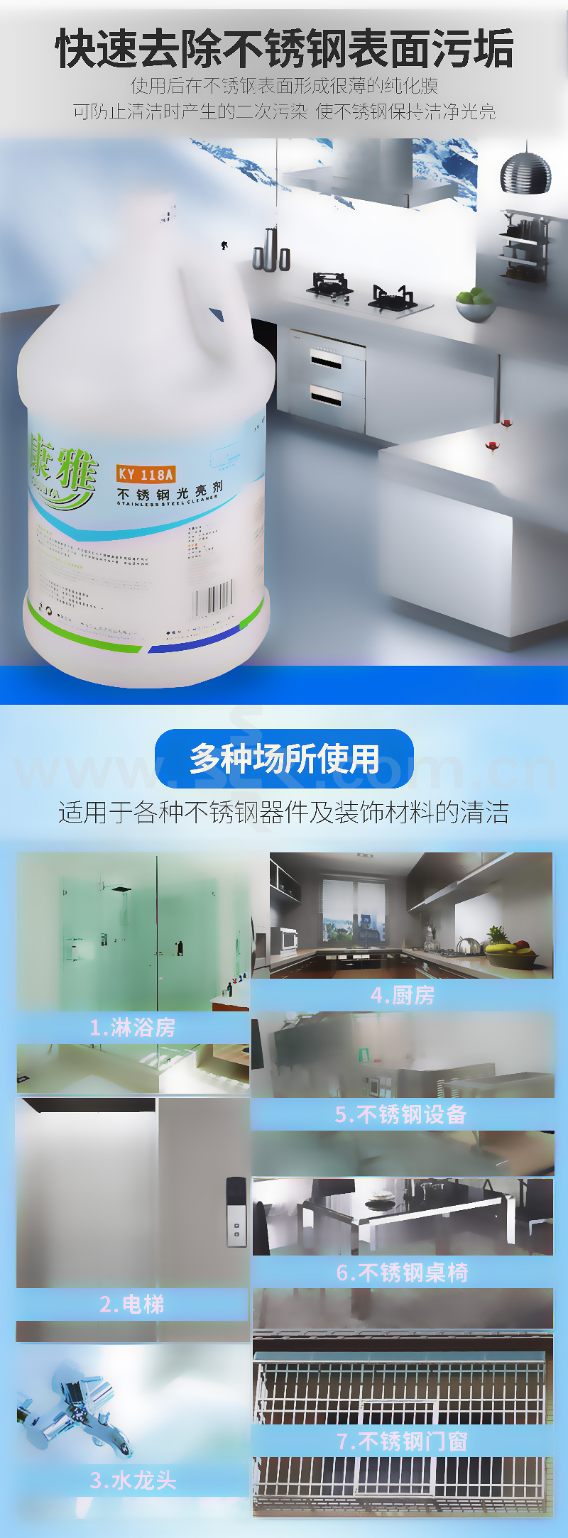 ·本产品能迅速去除不锈钢表面污垢,而且使用后在不锈钢表面形成极薄的钝化膜,可防止清洁时产生二次污染,使不锈钢保持洁净光亮。