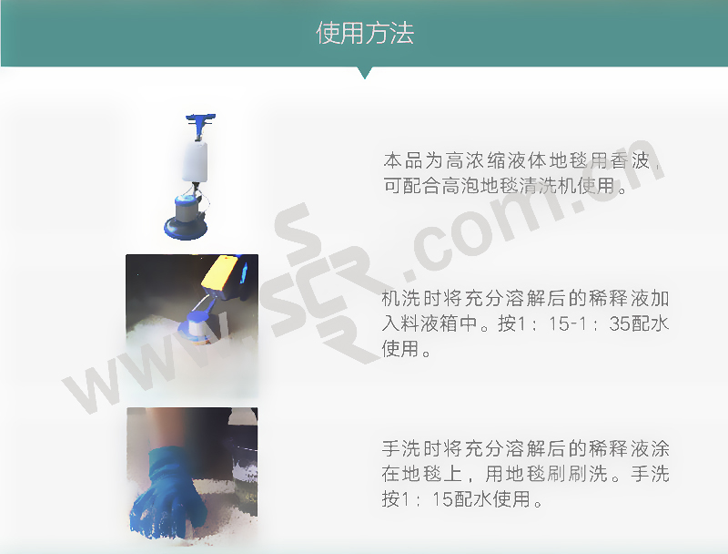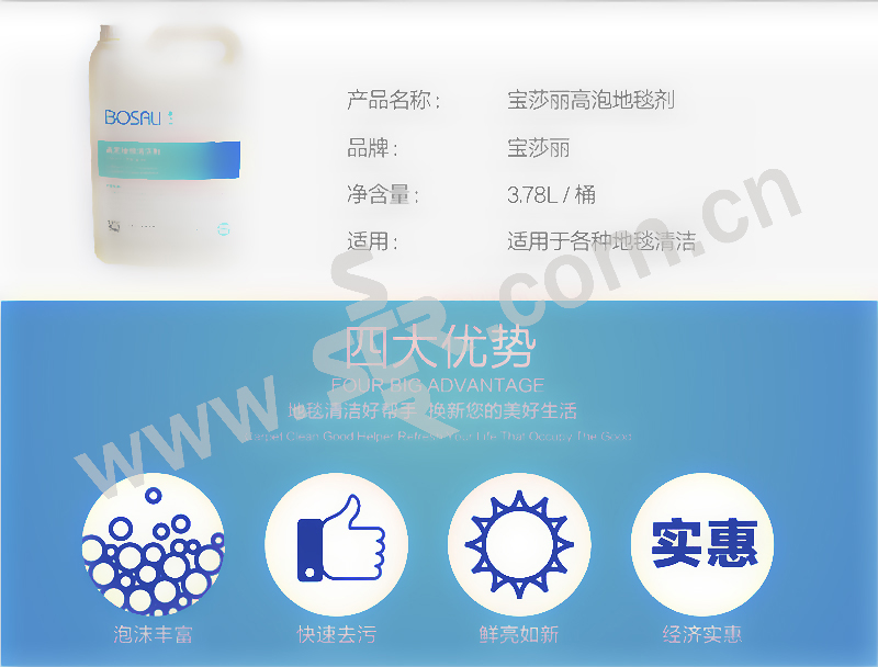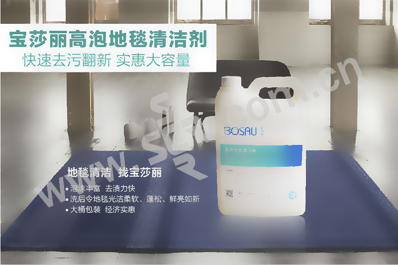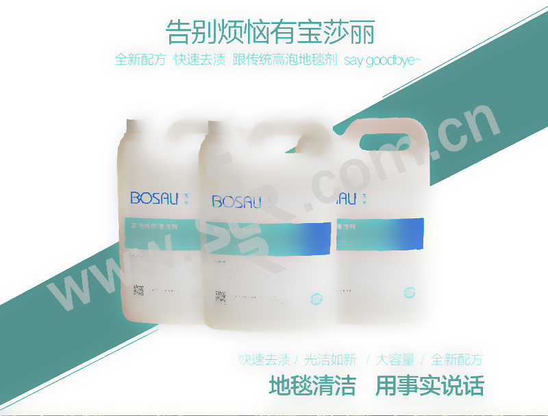 ·用于地毯表面的污垢的清洗,在高泡地毯剂的作用下,洗涤剂产生丰富的泡沫,使泡沫附着在地毯上,使清洁剂的去污能力和地毯机施加的机械能同时发生作用