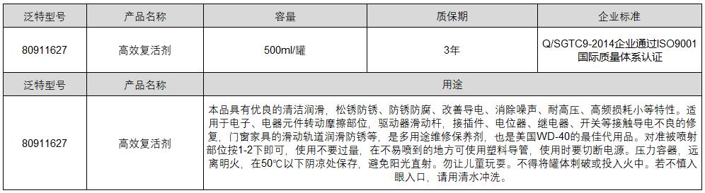 ·经久耐用,产品物美价廉 ·企业标准:Q/SGTC9-2014企业通过ISO9001国际质量体系认证 ·用途:本品具有优良的清洁润滑,松锈防锈、防锈防腐、改善导电、消除噪声、耐高压、高频损耗小等特性。 ·是多用途维修保养剂,也是美国WD-40的较佳代用品。对准被喷射部位按1-2下即可,使用不要过量,在不易喷到的地方可使用塑料导管,使用时要切断电源。压力容器,远离明火,在50℃以下阴凉处保存,避免阳光直射。勿让儿童玩耍。不得将罐体刺破或投入火中。若不慎入眼入口,请用清水冲洗。