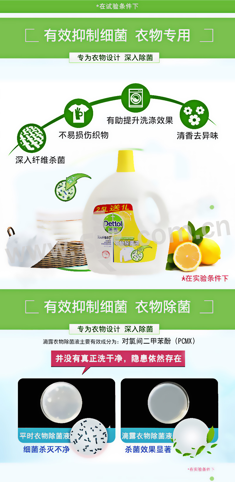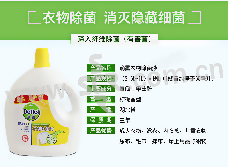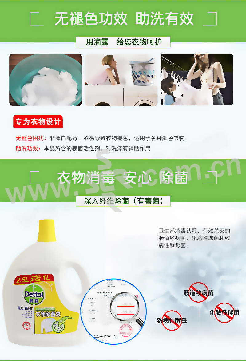 水溶性配方,深入衣物纤维,有效去除隐藏在其中的在汗液等分泌物中滋生的细菌,如:大肠杆菌,白色念珠菌及金黄色葡萄球菌。