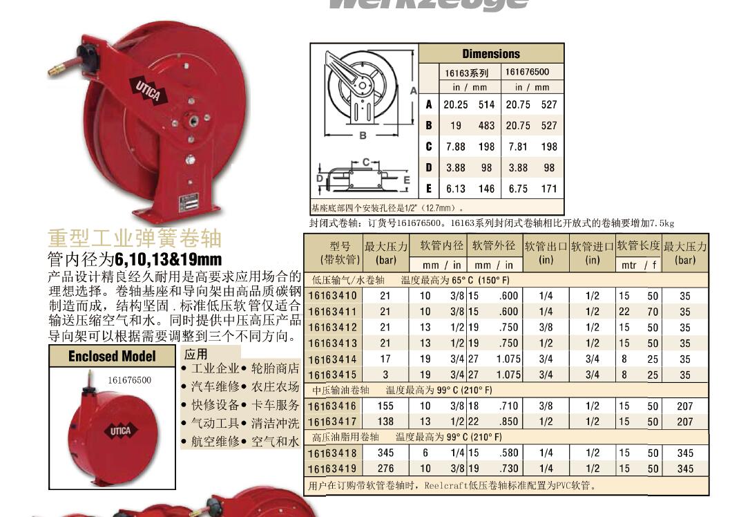 ·产品设计精良经久耐用是高要求应用场合的理想选择。卷轴基座和导向架由高品质碳钢制造而成,结构坚固.标准低压软管仅适合输送压缩空气和水。同时提供中压高压产品导向架可以根据需要调整到三个不同方向。