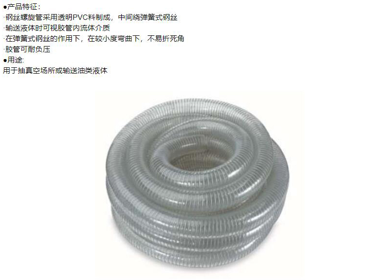 ·钢丝螺旋管采用透明PVC料制成,中间绕弹簧式钢丝 ·输送液体时可视胶管内流体介质 ·在弹簧式钢丝的作用下,在较小度弯曲下,不易折死角 ·胶管可耐负压