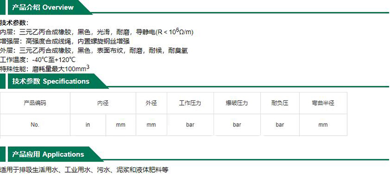 ·内层:三元乙丙合成橡胶,黑色,光滑,耐磨,导静电(R<106Ω/m) ·增强层:高强度合成线绳,内置螺旋钢丝增强 ·外层:三元乙丙合成橡胶,黑色,表面布纹,耐磨,耐候,耐臭氧 ·工作温度:-40℃至+120℃ ·特殊性能:磨耗量最大100mm3