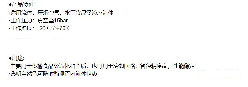 ·适用流体:压缩空气,水等食品级液态流体 ·工作压力:真空至15bar ·工作温度:-20℃至+70℃