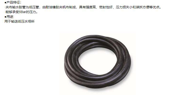 ·夹布输水胶管为低压管,由耐油橡胶夹帆布制成,具有强度高、密封性好、压力损失小和装拆方便等优点。