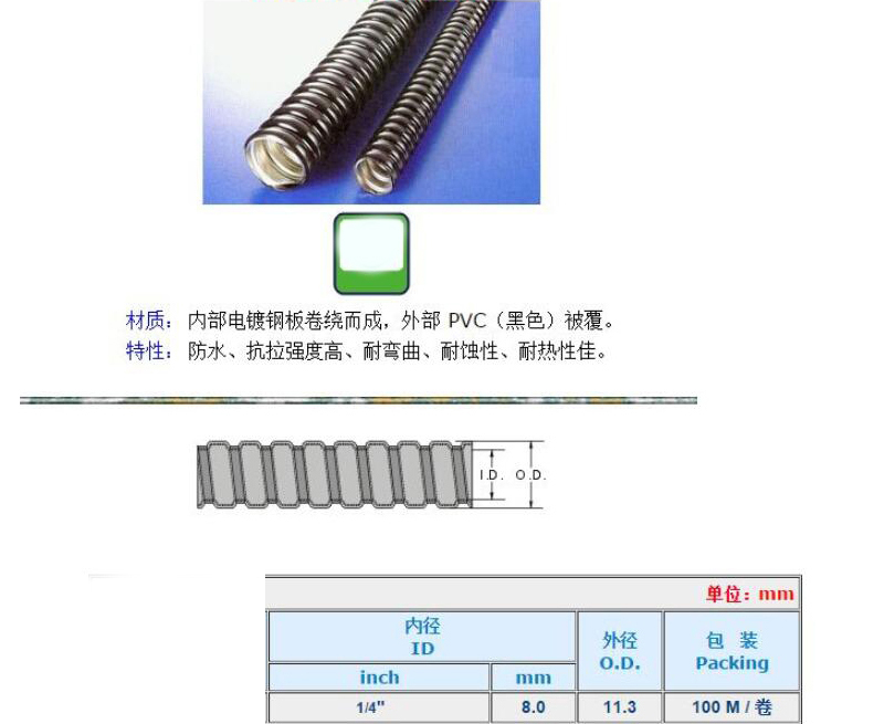 ·内部电镀铁板卷绕而成,外部PVC(黑色)披覆 ·防水、抗拉强度高、耐弯曲、耐腐蚀、耐热性佳