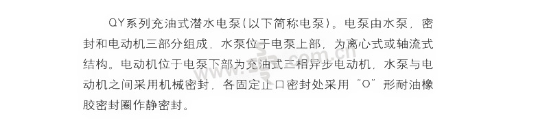 ·电动机位于电泵下部为充油式三相异步电动机,水泵与电动机之间采用机械密封,各固定止口密封处采用“O”形耐油橡胶密封圈作静密封