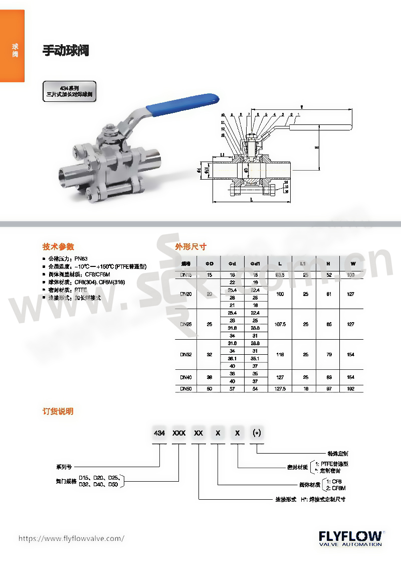 FLYFLOW/福莱福流 434系列三片式加长焊接球阀 434D15H11 DN15 CF8不锈钢阀体 公称压力16bar 1个