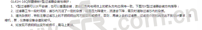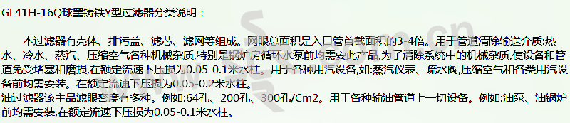·GL41H-16Q球墨铸铁Y型过滤器是输送介质的管道系列不可缺少的一种装置,通常安装在减压阀、泄压阀、定水位阀或其它设备的进口端,用来消除介质中的杂质,以保护阀门及设备的正常使用。该过滤器具有结构先进,阻力小,排污方便等特点。适用介质可为水,油、气。可按用户要求制作滤网,其外型基本相同(Y型),内部件全部采用不锈钢,坚固耐用。当需要清洗时,只要将可拆卸的滤筒取出,去除滤出的杂质后,重新装入即可