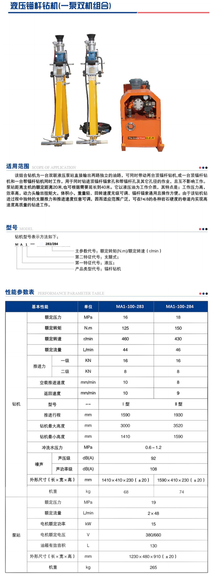 ·该组合钻机为一台双联液压泵站直接输出两路独立的油路,可同时带动两台顶锚杆钻机,或一台顶锚杆钻机和一台帮锚杆钻机同时工作,用于同时钻进顶锚杆锚索孔和帮锚杆孔及其它孔径的作业,且互不影响工作。泵站距离主机的额定距离20米,也可根据需要延长到40米。它以液压油为工作介质,其特点是;工作压力高,效率高,动力头输出扭矩大,体积小,重量轻、回转速度无级可调、锚杆锚索通用且操作方便。由于该钻机钻进过程中独特的支腿推力和推进速度任意可调,因而适应范围广泛,可在f≤8的各种岩石硬度的巷道内实现高速度高质量的钻进工作。