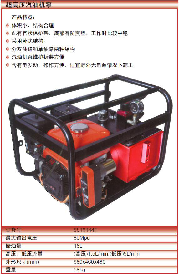 ·体积小,结构合理 ·配有官状保护架,底部有防震垫,工作时比较平稳 ·采用卧式结构。 ·分双油路和单油路两种结构 ·汽油机泵维护拆装方便 ·含有电发动,操作方便,适宜野外无电源情况下施工