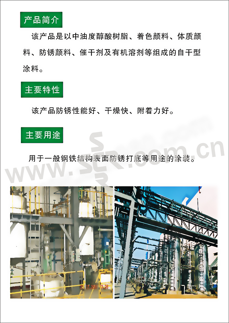 ·该产品防锈性能好、干燥快、附着力好。·该产品是以中油度醇酸树脂、着色颜料、体质颜料、防锈颜料、催干剂及有机溶剂等组成的自干型涂料。