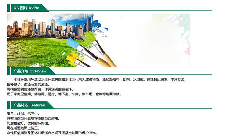 ·安全、环保、气味小 ·具有溶剂型环氧地坪漆的坚固耐用 ·防腐性能好、优良的装饰性 ·可在潮湿地面上施工 ·水性环氧树脂及固化剂最适合水泥及混凝土地面的保护装饰