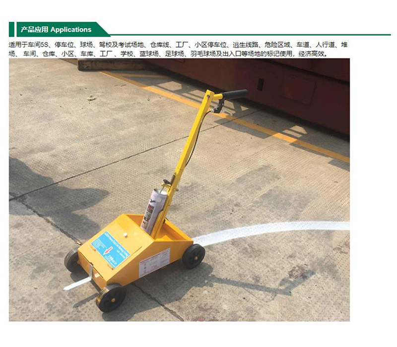 ·新型喷嘴,可提高划线质量。 ·线型清晰、饱满,能较强地抵御气候的侵蚀,耐磨损,亦适用于不平整的地面。 ·30分钟快干,每罐漆840ml。