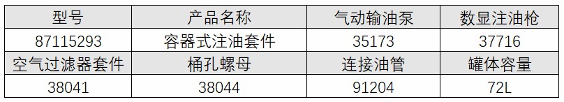 规格:  适用于180-220kg的手拖车式注油套件 制造商型号:  87115293