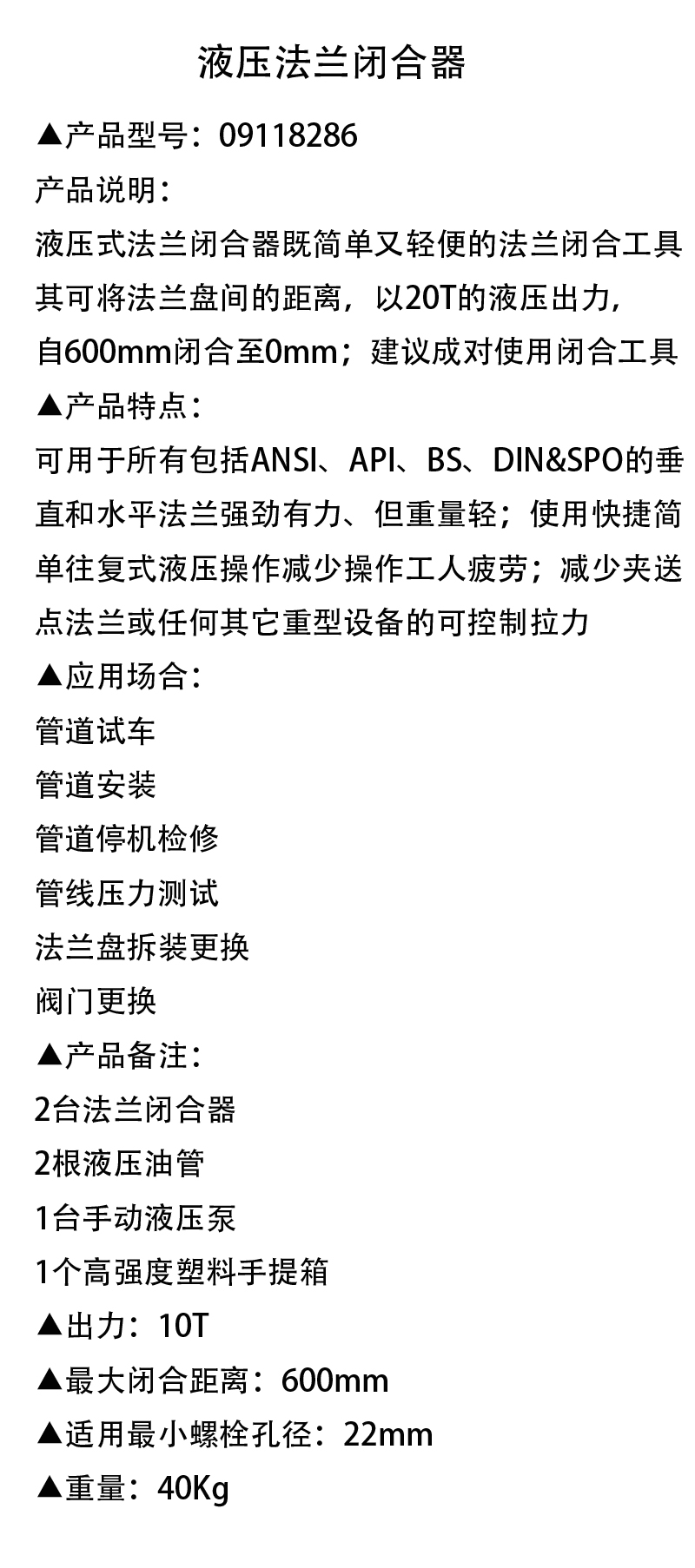 产品特点: 可用于所有包括ANSI,API,BS,DIN&SPO的垂直和水平法兰 强劲有力,但重量轻;使用快捷简单 往复式液压操作 减少操作工人疲劳;减少夹送点 法兰或任何其它重型设备的可控制拉力 应用场合:管道试车,管道安装,管道停机,检修管线压力,测试法兰盘拆装,更换阀门更换