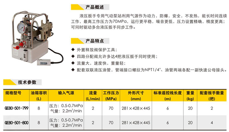 ·外置释放阀保护工具; ·四路分配阀允许多达4把液压扳手同时使用; ·流量大,速度快,重量轻; ·配套双联液压油管,管端接口螺纹为NPT1/4"、油管两端各配一副快速公母接头。