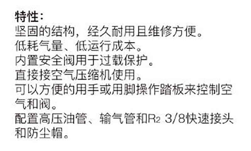 ·配置高压油管、输气管和R23/8快速接头和防尘帽。