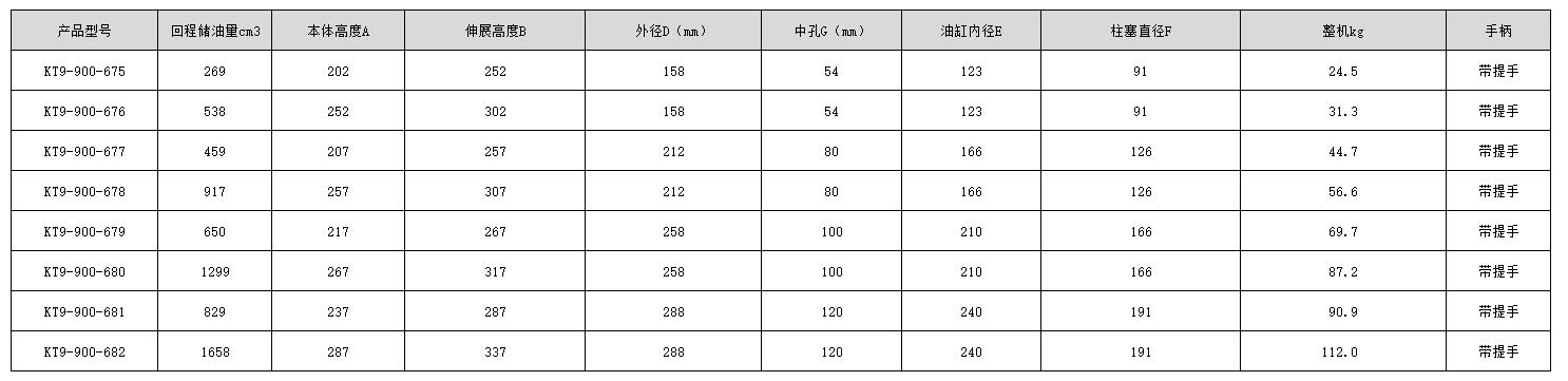 C21853 KT9-900-675 双作用通用 50mm 562KN 377KN 80.3cm2 53.8cm2 402cm3 269cm3 158mm 54mm 24.5kg 带提手 4640.00