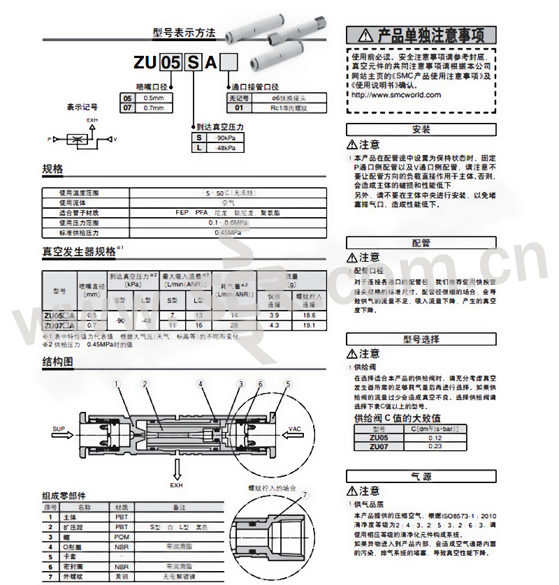 SMC ZU-A系列直通型真空发生器 ZU05LA 喷嘴口径0.5mm 最高真空压力-48kPa 压缩空气接口6mm 排气接口6mm 真空接口6mm 1个