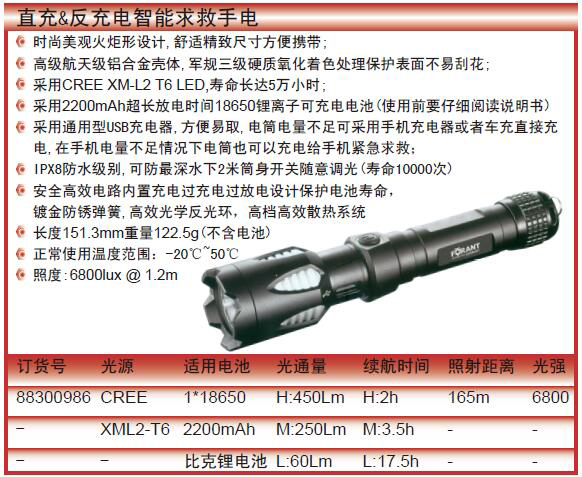 ·时尚美观火炬形设计,舒适精致尺寸方便携带; ·高级航天级铝合金壳体,军规三级硬质氧化着色处理保护表面不易刮花; ·采用CREE XM-L2 T6 LED,寿命长达5万小时; ·采用2200mAh超长放电时间18650锂离子可充电电池(使用前要仔细阅读说明书) ·采用通用型USB充电器,方便易取,电筒电量不足可采用手机充电器或者车充直接充电,在手机电量不足情况下电筒也可以充电给手机紧急求救; ·IPX8防水级别,可防最深水下2米筒身开关随意调光(寿命10000次) ·安全高效电路内置充电过充电过放电设计保护电池寿命,镀金防锈弹簧,高效光学反光环,高档高效散热系统 ·长度151.3mm重量122.5g(不含电池) ·正常使用温度范围:-20℃~50℃ ·照度:6800lux @ 1.2m