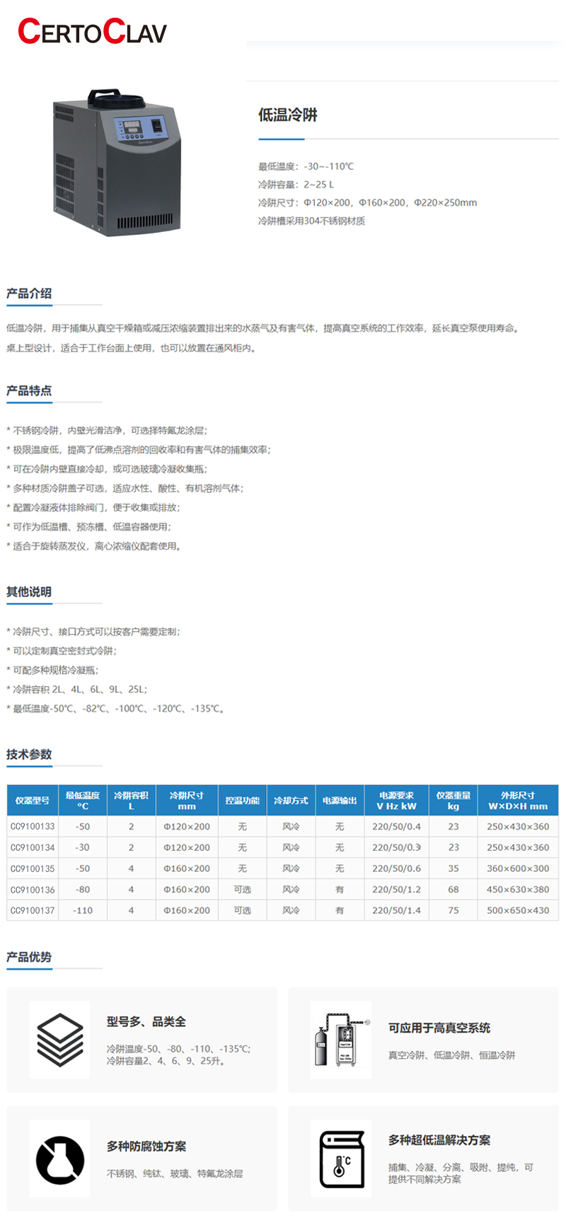 ·不锈钢冷阱,内壁光滑洁净,可选特氟龙涂层; ·极限温度低,提高了低沸点溶剂的回收率和有害气体的捕集效率; ·可在冷阱内壁直接冷却,或选配玻璃冷凝收集瓶; ·多种材质冷阱盖子可选,适应水性、酸性、有机溶剂气体; ·配置冷凝液体排出阀门,便于收集或排放; ·可作为低温槽、预冻槽、低温容器使用; ·适合于旋转蒸发仪、离心浓缩仪配套使用。
