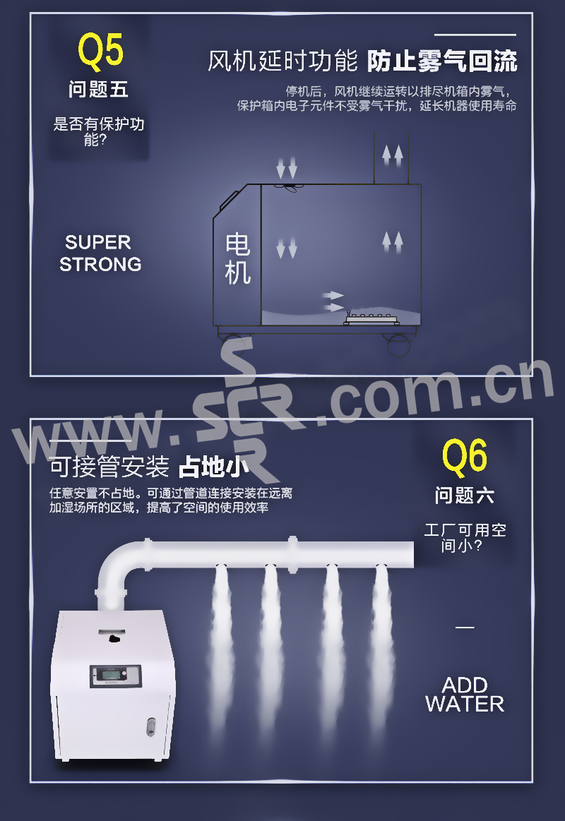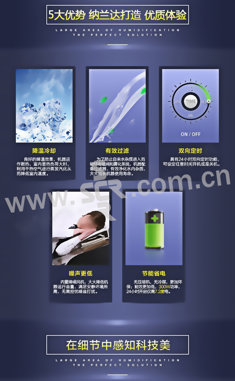 ·人性化工业设计进水口·进水口可接水质过滤器;溢水口有效保障水位高低;排水口方便清洗排污。·大出雾口,只需简单组装管子,便可使用。·过滤器特有过滤器设计,防止水中杂质进入,避免影响电子器件使用寿命。·湿度传感器插口·随机配置湿度传感器可插入插口,随时检测当前环境湿度。·万向轮底座,优质万向轮,自带锁扣,拉下锁扣,便可锁住机身移动。想移动想固定,使用灵活自如。