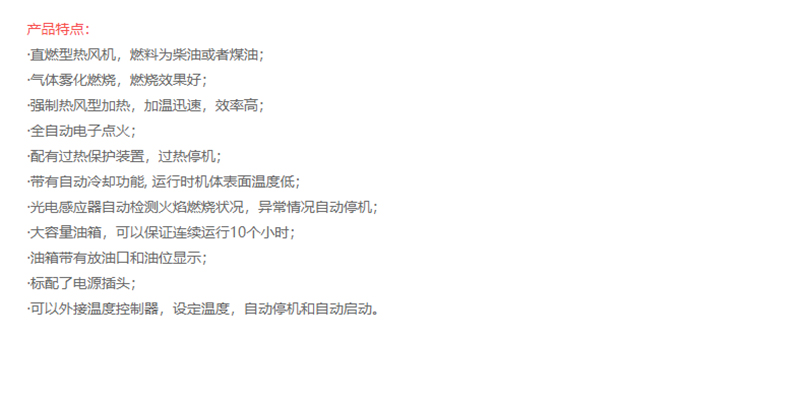 ·直燃型热风机,燃料为柴油或者煤油 ·气体雾化燃烧,燃烧效果好 ·强制热风型加热,加温迅速,效率高 ·全自动电子点火 ·配有过热保护装置,过热停机 ·带有自动冷却功能,,运行时机体表面温度低 ·光电感应器自动检测火焰燃烧状况,异常情况自动停机 ·大容量油箱,可以保证连续运行10个小时 ·油箱带有放油口和油位显示 ·标配了电源插头 ·可以外接温度控制器,设定温度,自动停机和自动启动