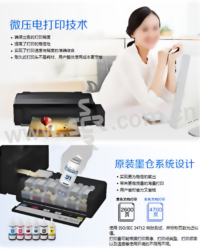 ·A3+大幅面无边距打印,表现更出色优化5760dpi,墨滴尺寸可小至1.5微微升·六色原装墨水,细腻画质,恒久靓丽更大印量(黑色约2,600页/彩色约4,700页),成本无忧·无碳粉粉尘,零臭氧排放, 原厂保修(含打印头),安心无忧