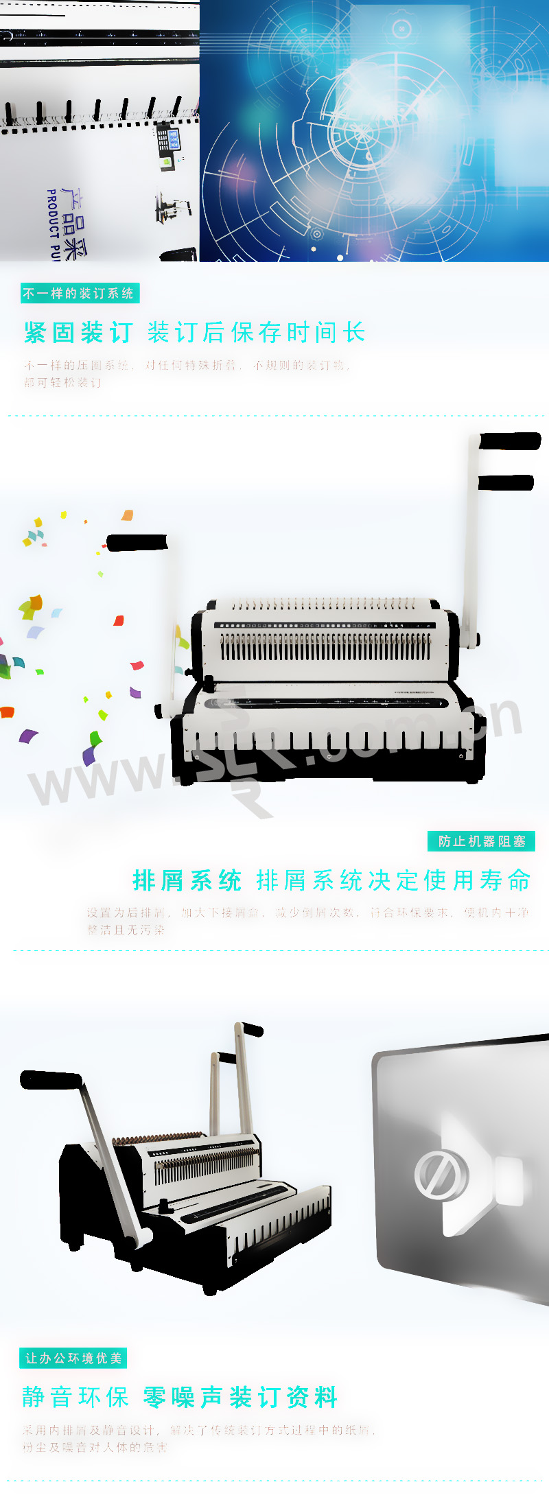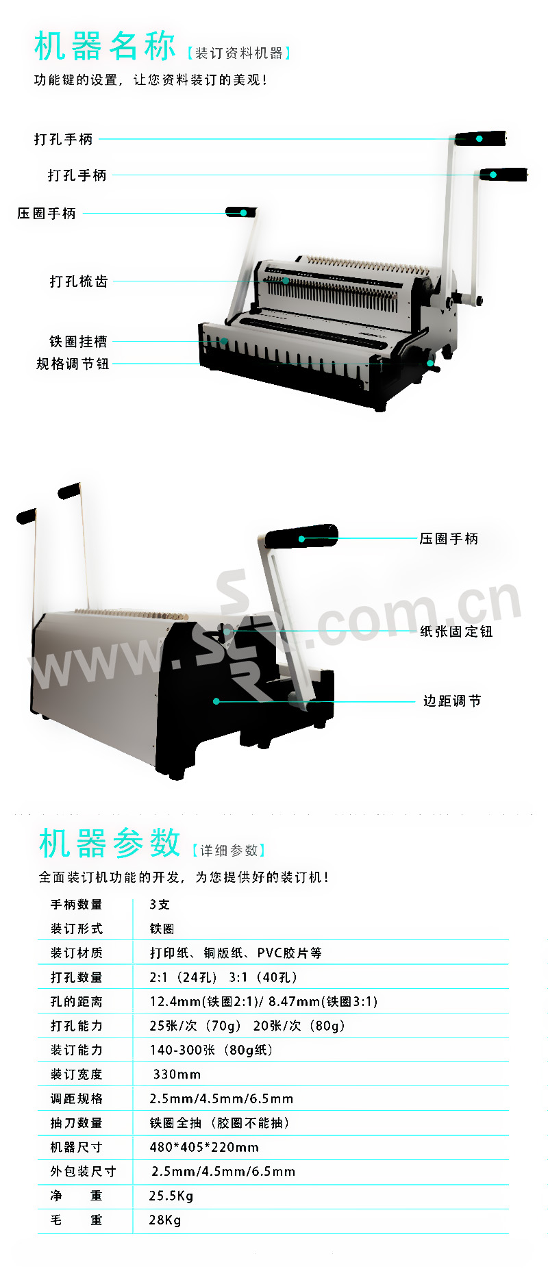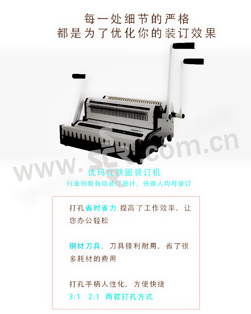 ·功能参数:·金属机身:精钢机身结构,铁质白色面板,时尚大方·精刚刀片:上下刀口均选用高级精致钢材,先进技术工艺铸造,刀片锋利耐用,打孔不起毛边,加之蘸火处理,增加打孔的硬度,使用寿命可达上万次·抽拔刀设计:打孔刀均可抽拔,可根据制作需求进行打孔·超厚打孔设计:机器可以满足一次打孔20(80g)/25张(70g)的超大厚度,充分满足了客户的打孔需求·省力打孔设计:采用加长手柄,符合杠杆设计原理,使用省时省力·定位按钮设计:有效固定资料的打孔位置,