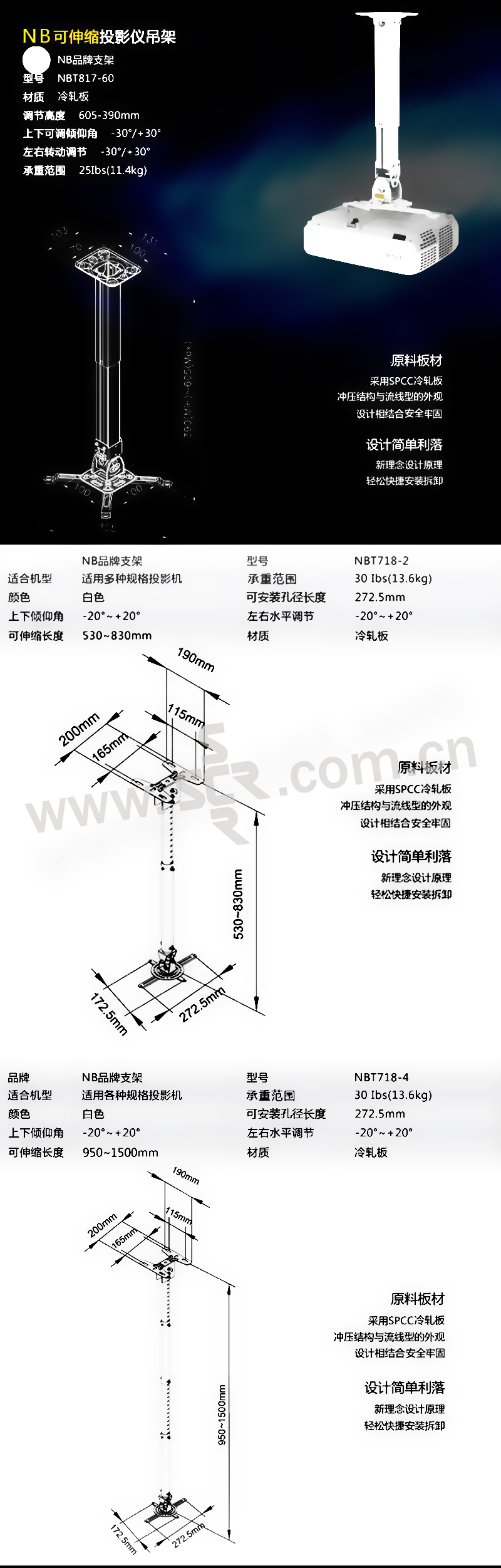 NB 投影仪吊架 T718-4 长度950~1500mm 白色 1个