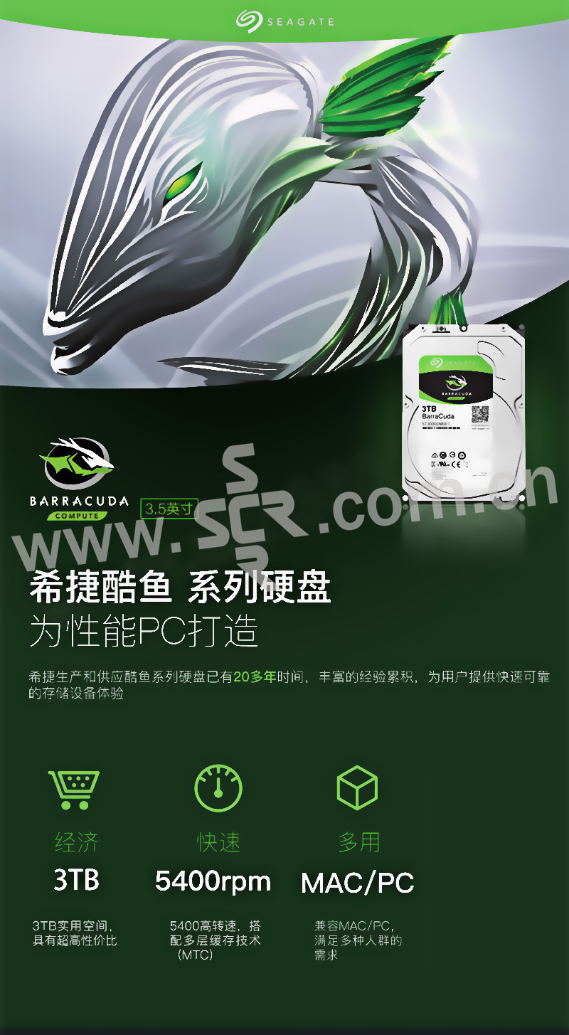 SEAGATE/希捷 酷鱼系列台式机机械硬盘 ST3000DM007 3TB SATA 5400RPM 256MB 1个