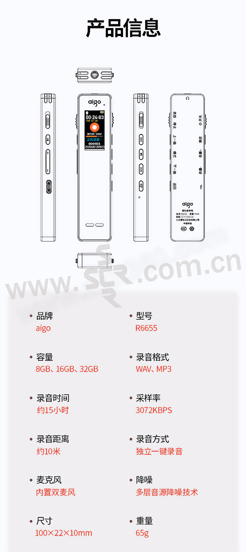 AIGO/爱国者 录音笔 R6655 16GB 黑色 1支