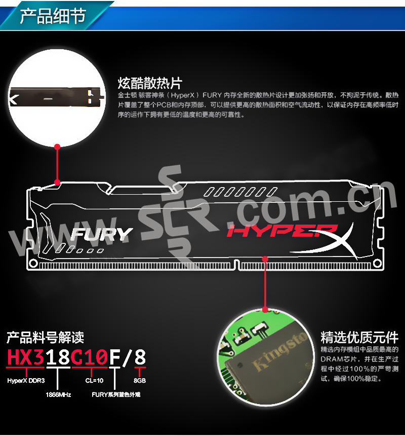 KINGSTON/金士顿 台式机内存 HX318C10F/8-SP 容量8GB 速度DDR3 1866 CL值10 工作电压1.5V 1个