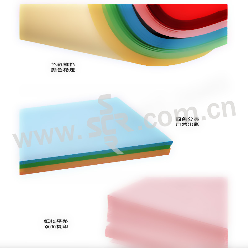 ·彩色复印纸具有很多颜色,大多是以色系为分类,浅色系包括绿色、蓝色、黄色、粉红色、浅灰色、浅紫色等