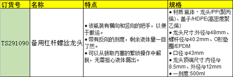 · 该瓶装有横向和竖向的把手,以便于搬运。 · 带有反向的刻度,剩余液体量一目了然。 · 可以从拔取内塞的繁琐操作中解脱,无需担心液体漏出。