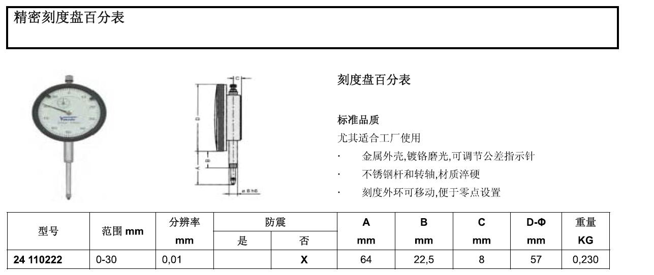 ·金属外壳·镀铭磨光·可调节公差指示针 ·不锈钢杆和转轴·材质淬硬 ·刻度外环可移动·便于零点设置