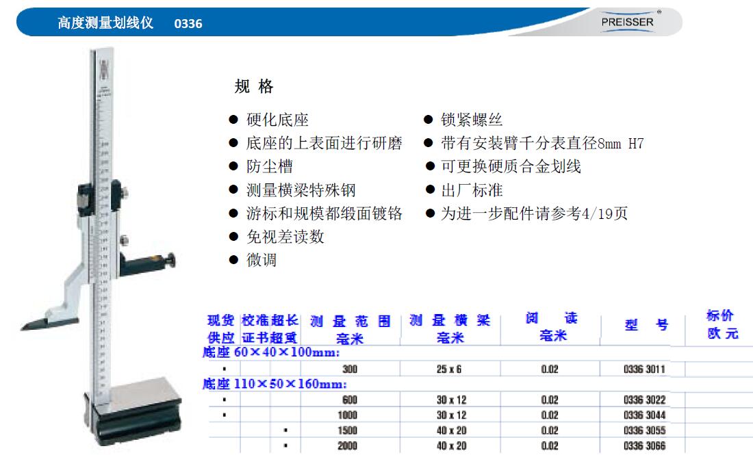 硬化底座 ·底座的上表面进行研磨 ·防尘槽 ·测量横梁特殊钢 ·游标和规模都缎面镀铬 ·免视差读数 ·微调 ·锁紧螺丝 ·带有安装臂千分表直径8mmH7 ·可更换硬质合金划线 ·出厂标准