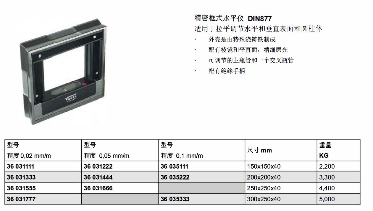 ·精密框式水平仪 DIN877 ·适用千拉平调节水平和垂直表面和圆柱体外壳是由特殊浇铸铁制成 ·配有棱镜和平直面. 精细磨光可调节的主瓶管和一个交叉瓶管配有绝缘手柄
